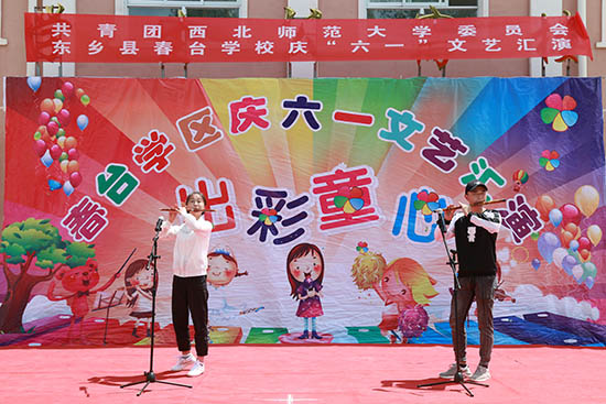西北师大书法协会、魔术协会、笛萧社团及“爱尚微公益——爱在远山”实践项目志愿者们为小学生表演了民族舞蹈、竹笛重奏、书法展示、互动魔术等形式多样的文艺节目。美术学院青年志愿者为春台学校创作了校园文化墙。