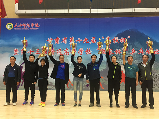 为贯彻落实《甘肃省关于强化学校体育促进学生身心健康全面发展实施方案的通知》精神,9月13日至17日,由教育厅主办、天水师范学院承办的甘肃省第十九届“高校杯”暨第十三届普通高等学校“校长杯”乒乓球比赛于2018年在天水举行。